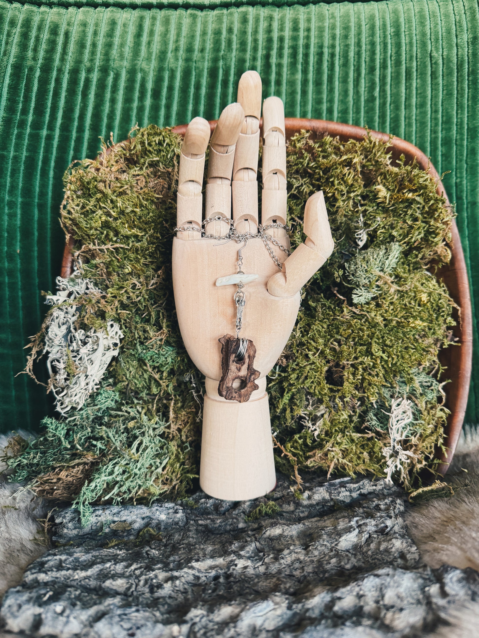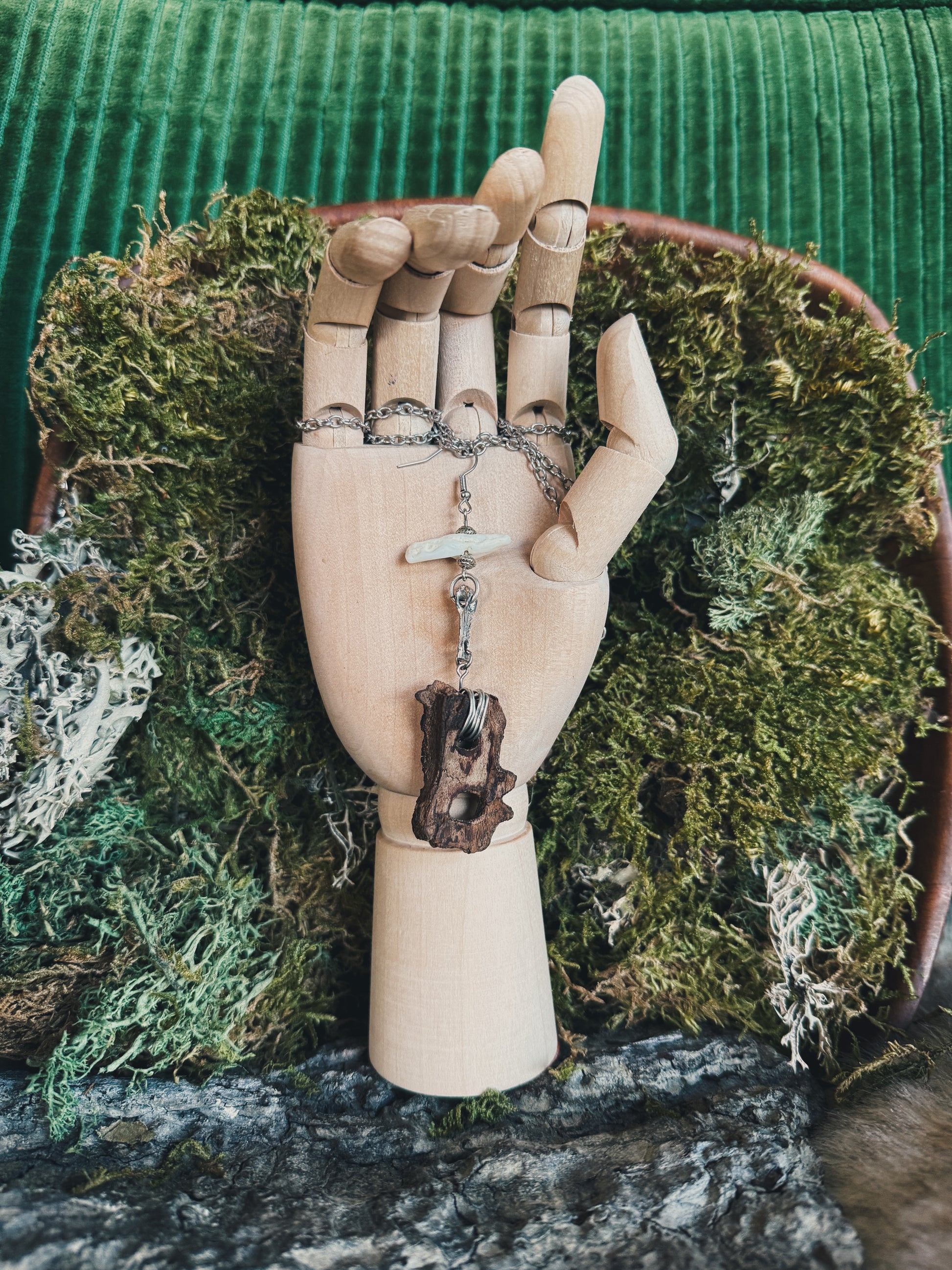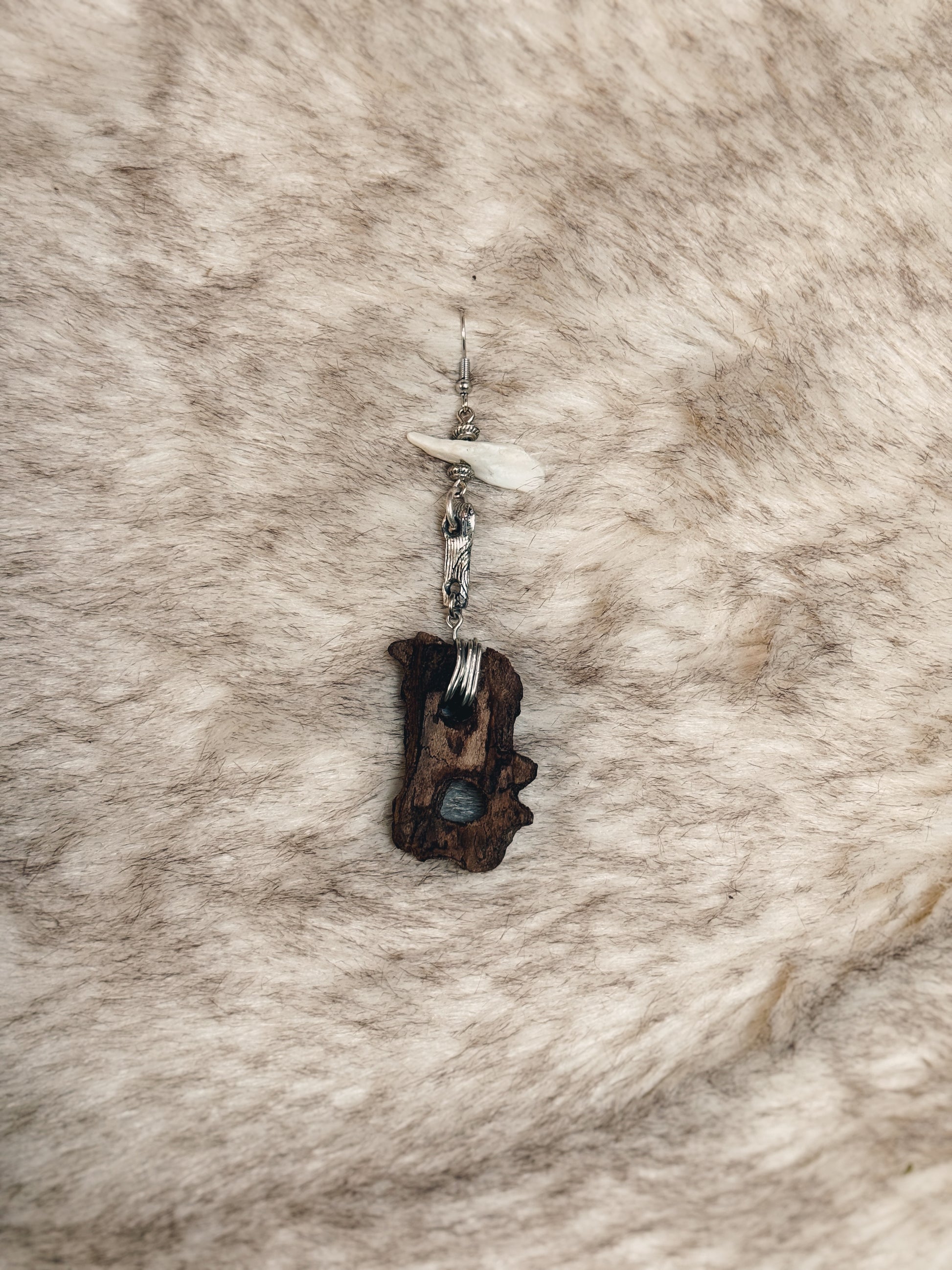 One-of-a-kind earring made with a raw, fallen and foraged fragment of bark, cozily wrapped and attached by an engraved metal finding, accented with a seashell fragment between two metal accent beads